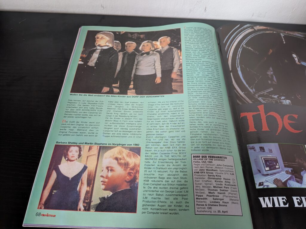 John Carpenter hat 1995, eine Kleinigkeit bei den Kindern geändert. Bei ihm waren ein Junge und ein Mädchen ein Pärchen und waren auch direkt verbunden. Dadurch, dass es eine Totgeburt gab und David dadurch sein Gegenstück fehlt, entwickelt er so etwas wie Gefühle, was auch ein netter Ansatzpunkt war. Auch die Effekte mit den Augen waren im Remake besser. Im Original waren es nur Standbilder der Kinder und im Nachhinein hat man wohl die Augen animiert. Dies konnte man Anfang der Sechziger wohl auch nicht anders umsetzen. Im 1960er Film war auch wie im Buch, David der „Chef“ der Bande. In Carpenters Film ist es die Tochter des Arztes.