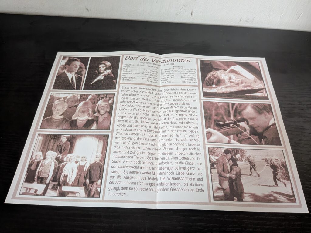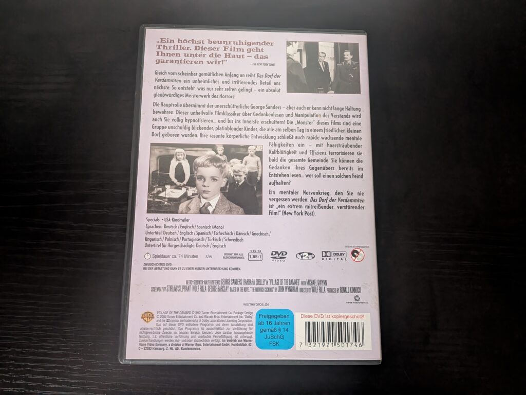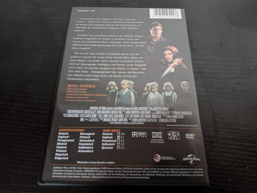 Ich habe den Film heute das erste Mal gesehen und kannte bisher nur das VHS Cover mit diesen fürchterlich aussehenden Kindern. Ich muss gestehen, dass mir bis zu dem Punkt als ich mir die DVD bestellt habe, nicht klar war, dass es sich um eine Buchverfilmung von John Wyndham handelt. Ich dachte bisher immer es handelt sich um eine typische 90er Jahre TV Verfilmung eines Stephen King Romans.